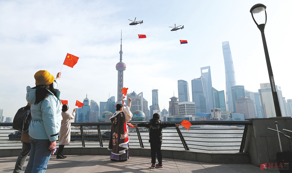 日,在上海外滩游览的市民游客在两架悬挂国旗和警旗的警航直升机飞过时挥舞手中的国旗。