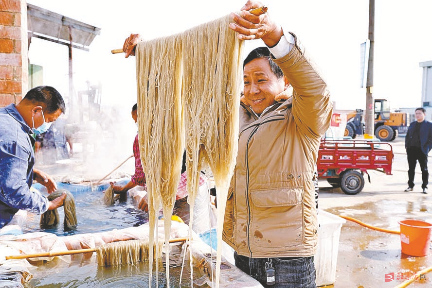 1月7日,寒气逼人,在正阳县雷寨乡关路口村的一个个粉条加工点,却是一派热火朝天的场面。据粉条加工大户张光辉介绍,他的加工点现在一天能出3000斤粉条,10多个人劳作,每人每天可挣200多元钱。目前,粉条加工已让关路口村村民过上了幸福生活。
