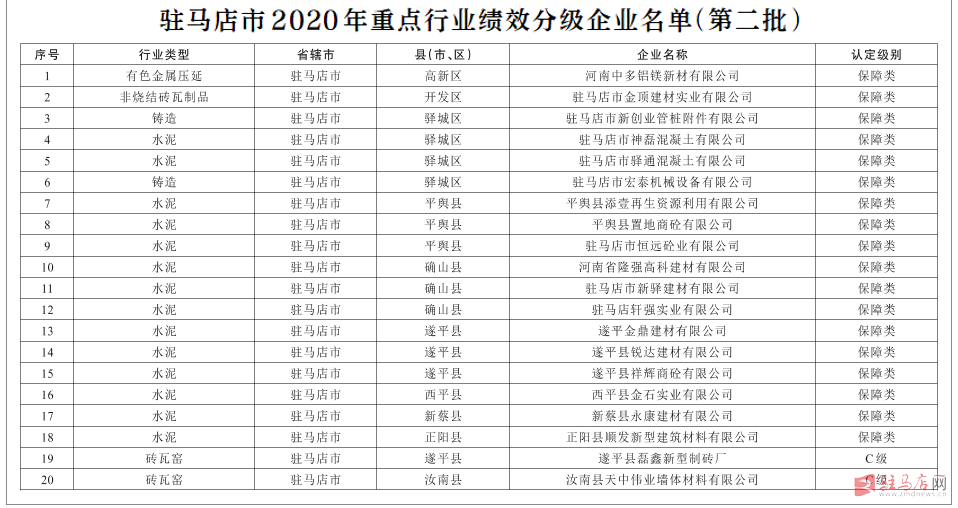 为积极有效应对重污染天气,精准提升差异化管控效果,突出精准治污、科学治污、依法治污,保障人民群众身体健康,按照《河南省2020年重污染天气重点行业绩效分级实施办法》绩效评定工作要求,本着公开、公平、公正和透明的原则,市生态环境局组织开展了2020年第二批重点行业绩效分级评审工作,按照企业自评、资料审核、现场核验、报请省厅复审的程序,经省厅最终审核认定民生保障类企业18家,经市级审核评级C级企业2家。现将第二批重点行业绩效分级企业等级清单进行公告,接受公众监督。