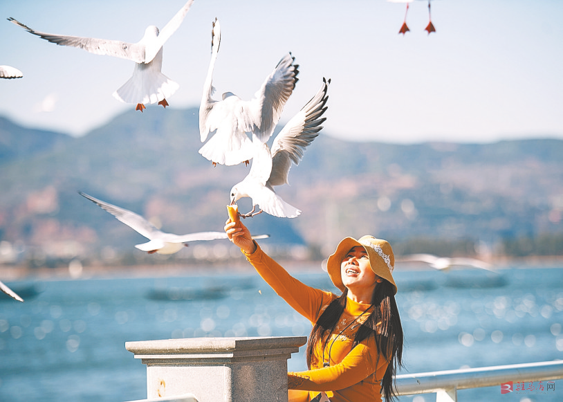 2月11日是农历大年三十,游客在昆明海埂大坝给红嘴鸥喂食,其乐融融,迎接新年。新华社记者 王冠森 摄