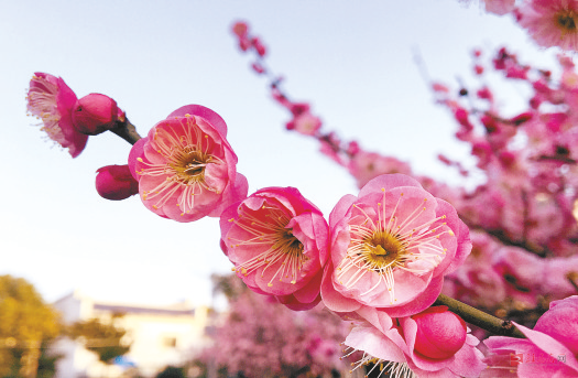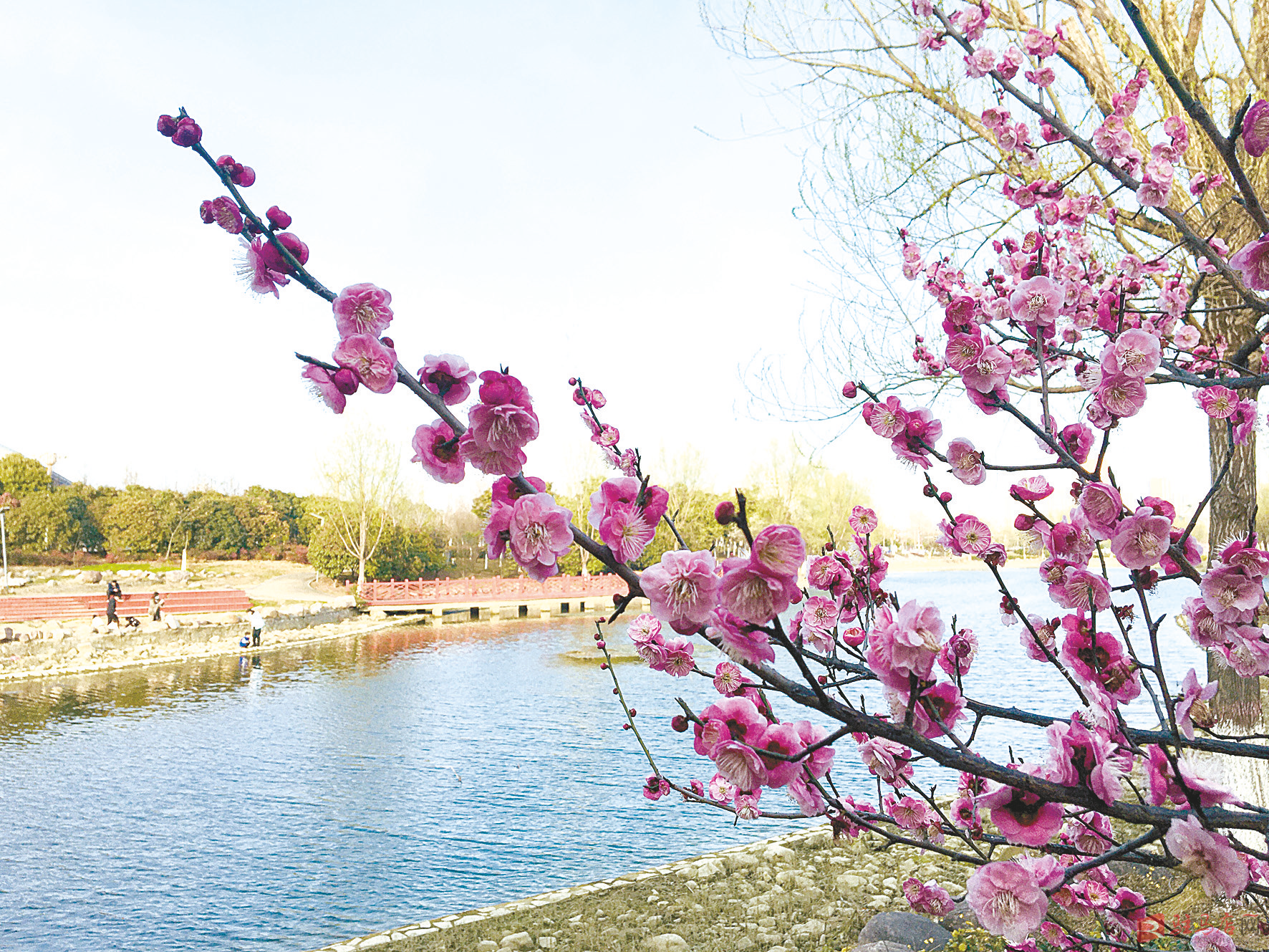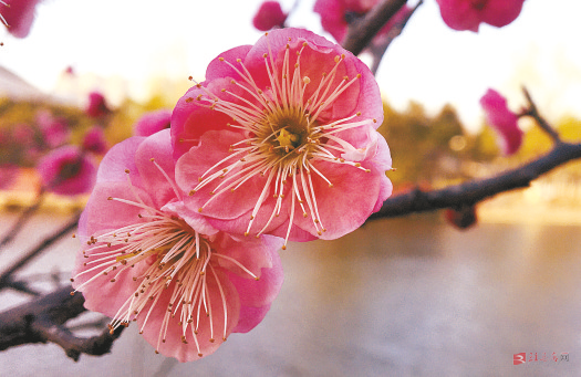 图为市区开源大道旁开源湖畔梅花怒放引来游人观赏。