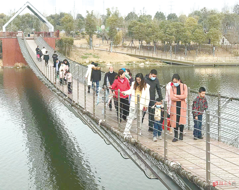 在市区滨河公园吊桥上游玩的市民。