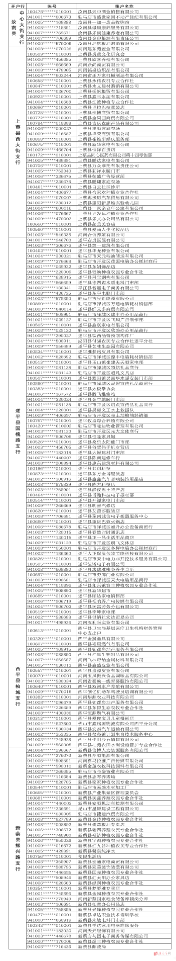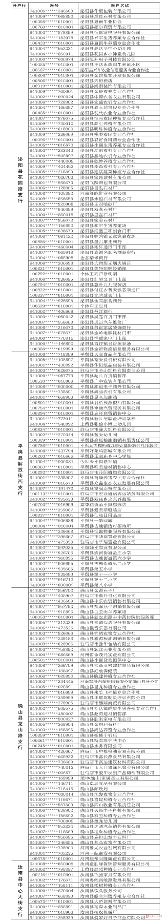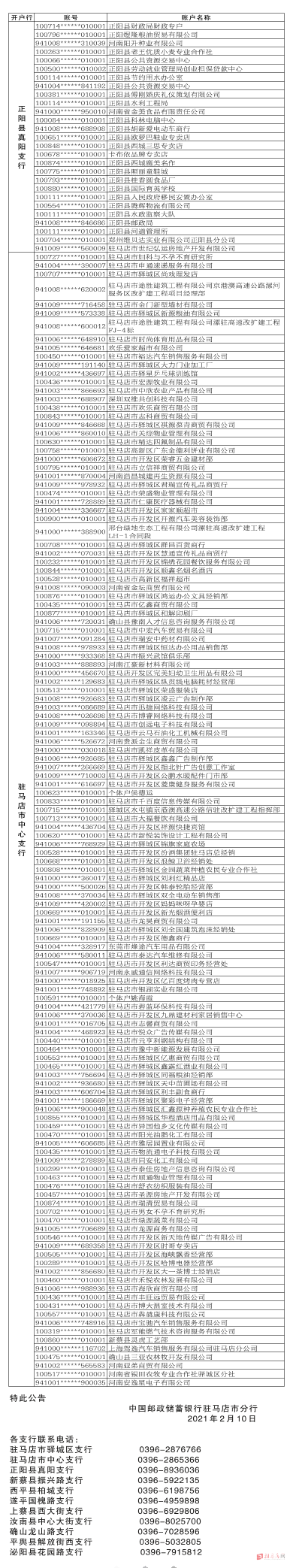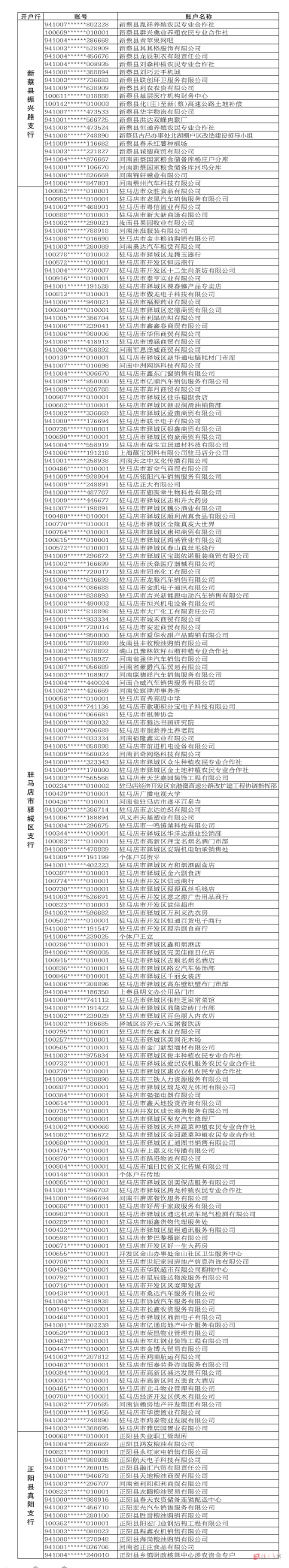 贵单位在中国邮政储蓄银行驻马店市分行及其分支机构开立的单位银行账户,已超过一年未发生资金收付,结算账户已采取转为久悬户措施,请在本公告发出之日起30日内来我行开户网点办理账户撤销手续。如果逾期未办理的,我行将根据中国人民银行《人民币银行结算账户管理办法》(中国人民银行令[2003]第5号)、中国邮政储蓄银行河南省分行《关于开展对公低效账户清理工作的通知》(工作通知[2020]1650号)和账户管理协议约定,采取自动销户措施,敬请谅解。专此通知。账户信息如下表: