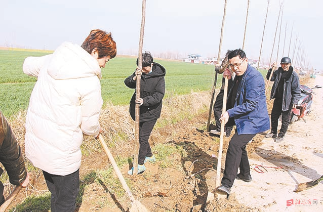 3月9日,遂平县槐树乡党委、乡政府组织人员,齐心协力在该乡罗庄村道路两旁植树600余棵,为春天增添新绿。