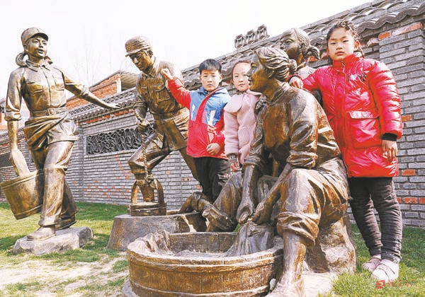 雷岗村的孩子们在村史馆前与雕塑合影。