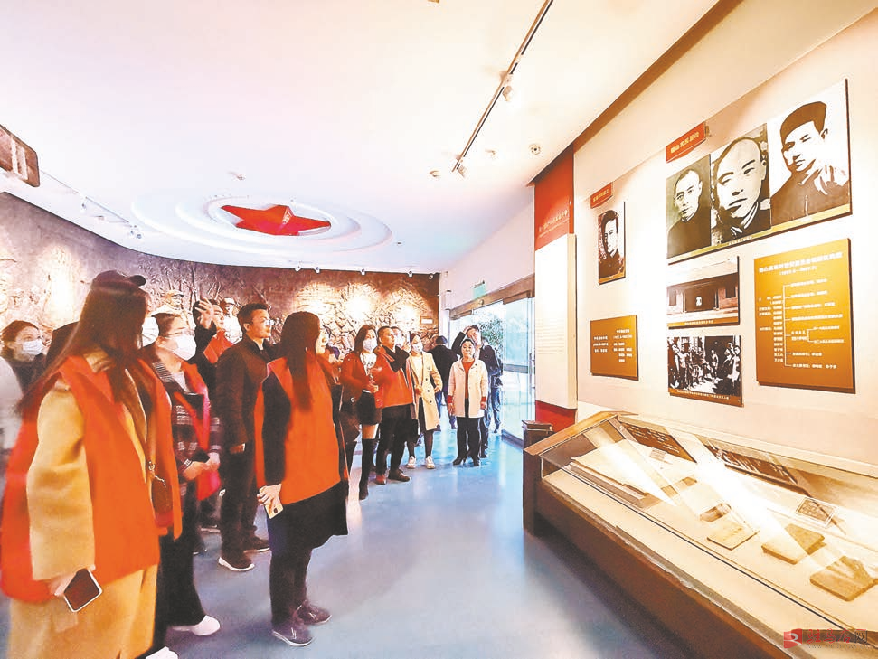 图为采访团在竹沟革命纪念馆参观。