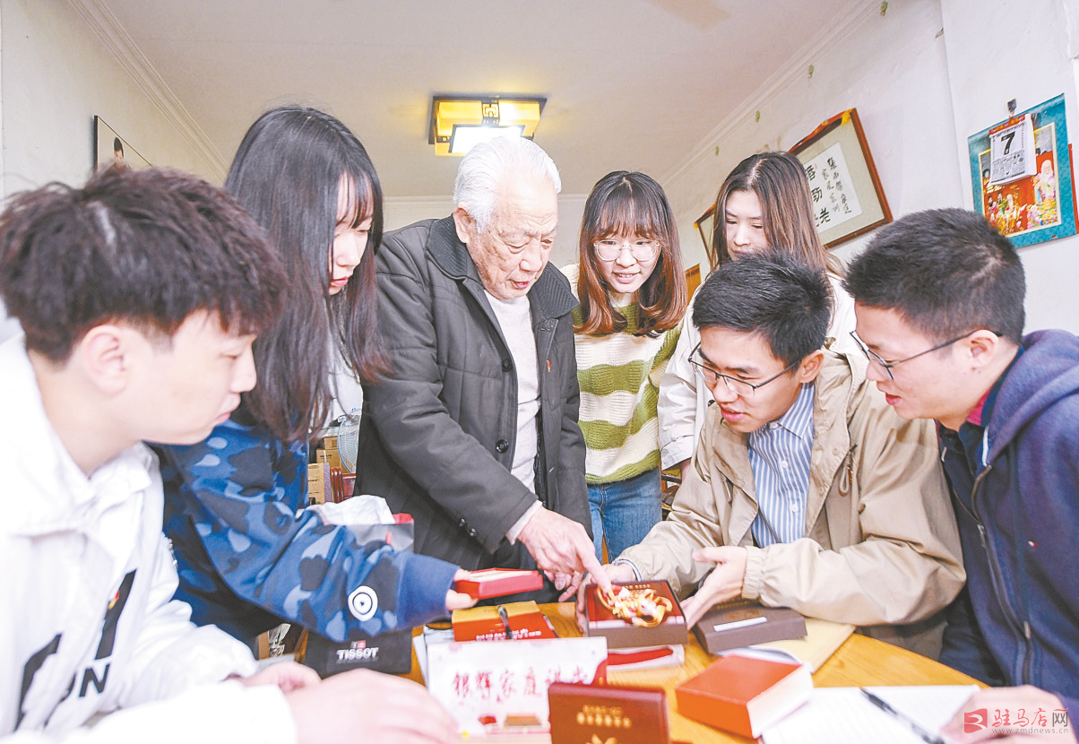 4月7日,91岁的老党员张西杰(左三)在讲述自己功勋章背后的“红色故事”。