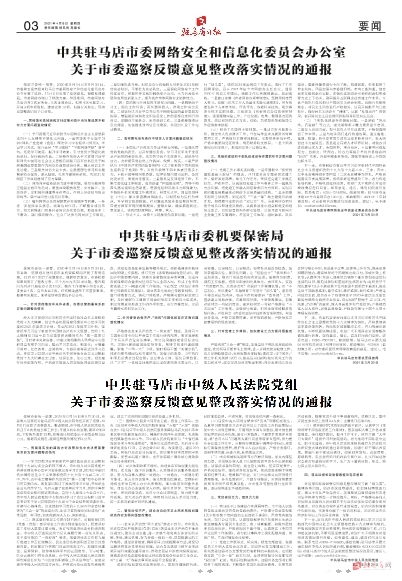 中共驻马店市委机要保密局 关于市委巡察反馈意见整改落实情况的通报