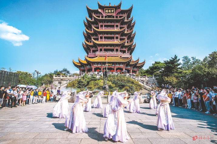 图④ 2020年10月1日,游客在武汉黄鹤楼景区观看演出。 新华社记者 肖艺九 摄