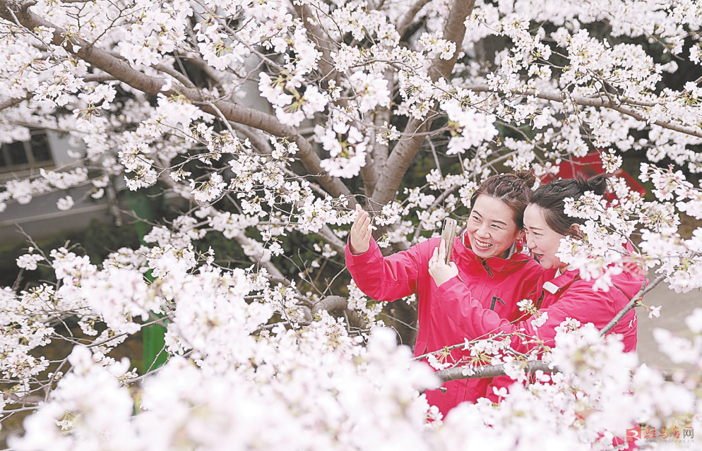 图② 3月13日,武汉雷神山医院医护人员在樱花树下赏花。当日,武汉大学抗疫医护人员赏樱专场启动,来自全国各地的援鄂抗疫英雄在樱花树下重逢,尽享樱花之约。 新华社记者 熊 琦 摄
