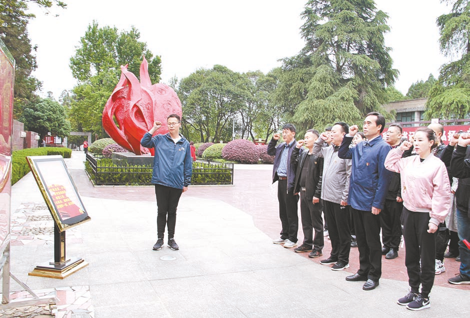 该中心全体党员干部走进鄂豫皖苏区首府烈士陵园向革命烈士敬献花篮,在烈士纪念塔前向烈士默哀,缅怀革命先烈,重温入党誓词,从百年党史中汲取奋进力量,激发党员干部理想信念。