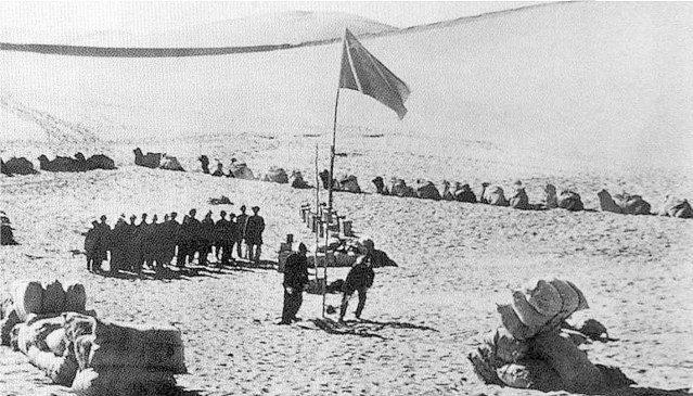 图② 1958年国庆节,横穿塔克拉玛干沙漠的石油地质队在沙漠举行升国旗仪式。