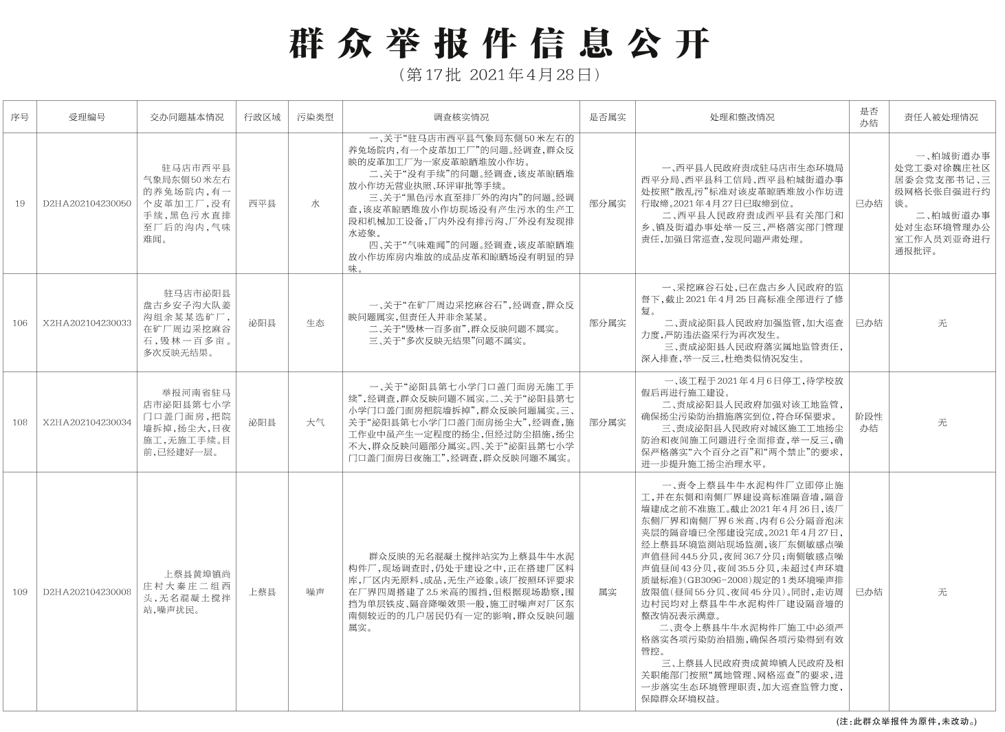 群众举报件信息公开(第17批 2021年4月28日)