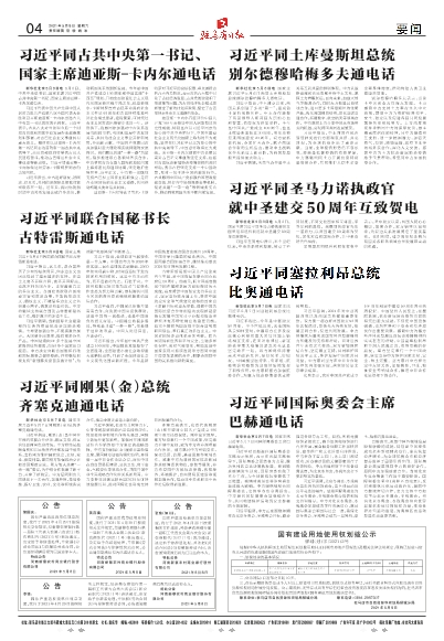 习近平同国际奥委会主席巴赫通电话