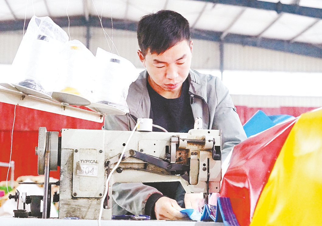 5月12日,位于汝南县的河南省恒泰华游乐设备有限公司厂区内,工人在对新生产的儿童游乐充气堡进行最后检查。该企业今年呈现产销两旺的好势头。