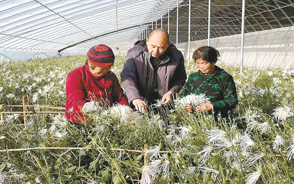 致富带头人向贫困户传授食用菊花采摘技术。