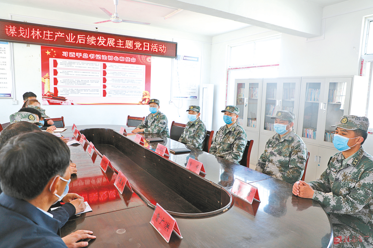 驻马店军分区机关与林庄村党支部开展主题党日活动,谋划林庄村产业后续发展。