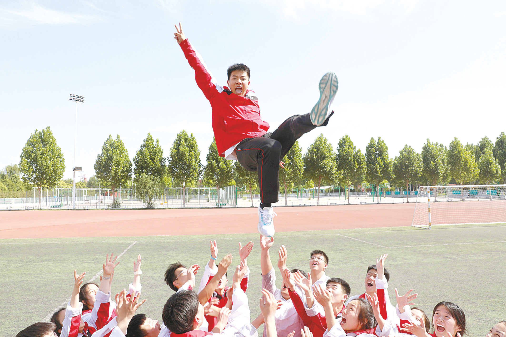 图① 5月29日,温县一中高三学生在操场上做减压游戏。