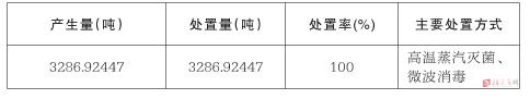2020年全市共产生医疗废物3286.92447吨,采用高温蒸汽灭菌消毒方式处置(其中平舆县诚信医疗环保科技有限公司处置方式为微波消毒)。处置量3286.92447吨,处置率为100%。