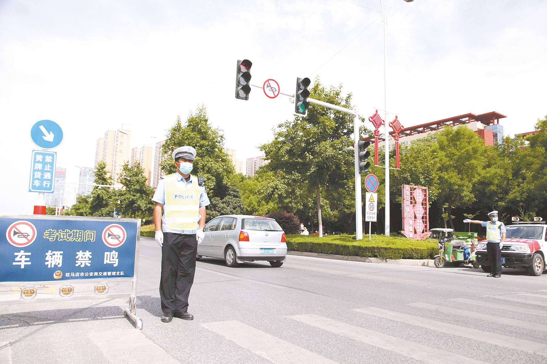 6月7日,市公安局交警支队开发区大队交警、辅警在驻马店高级中学新校区考点附近指挥交通。 记者 代廷伟 摄