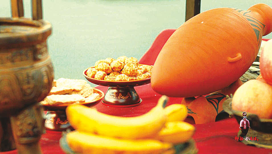 据考古学界研究,小口尖底瓶不仅是远古酒器,更沿袭了甲骨文中的象形“酒”字,同时将“尊”字在古代饮酒或作祭祀、双手捧着一个盛装着酒的小口尖底瓶的神态引申演绎出“尊敬”“尊崇”等含义。可以说,小口尖底瓶是祭拜洛水河神的场景中,作为文化符号以及文明载体的不二之选。