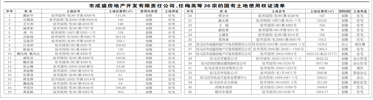 根据《中华人民共和国土地管理法》《中华人民共和国城乡规划法》等有关法律法规及驻马店市人民政府《关于依法收回市成盛房地产开发有限责任公司、任梅英等36宗国有土地并对ZMDY-2021-10号国有建设用地使用权实行拍卖出让的批复》(驻政〔2021〕101号)精神,市政府决定依法收回市成盛房地产开发有限责任公司、任梅英等36宗(见附件)位于交通路与风光路交叉口西北侧,土地登记总面积为24548.71(折合36.82亩)的国有土地使用权。由市不动产登记服务中心注销上述国有土地使用证,并对“驻市国用(2002)0953号”国有土地使用权证登记的剩余面积9204.45进行核减登记(见附件)。