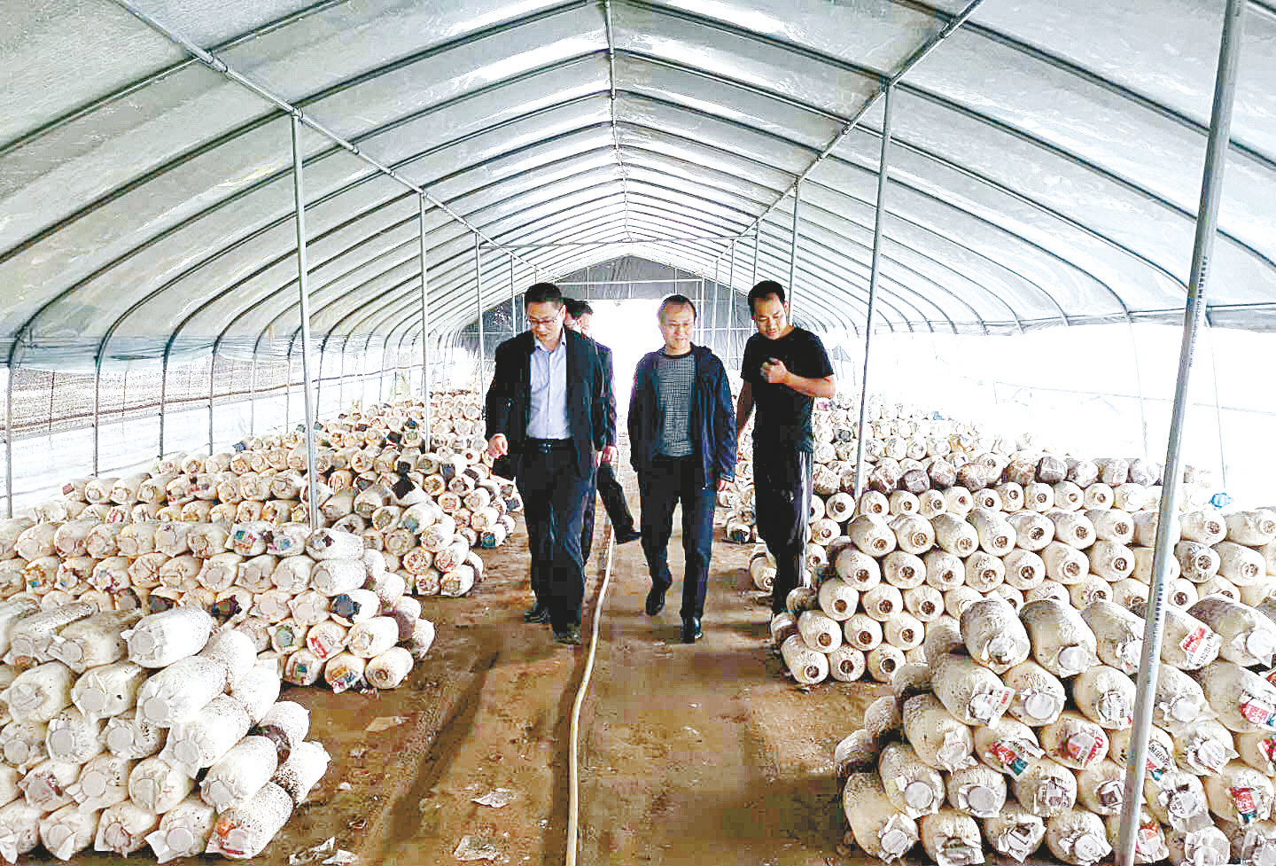 该行领导走访蘑菇种植大户。