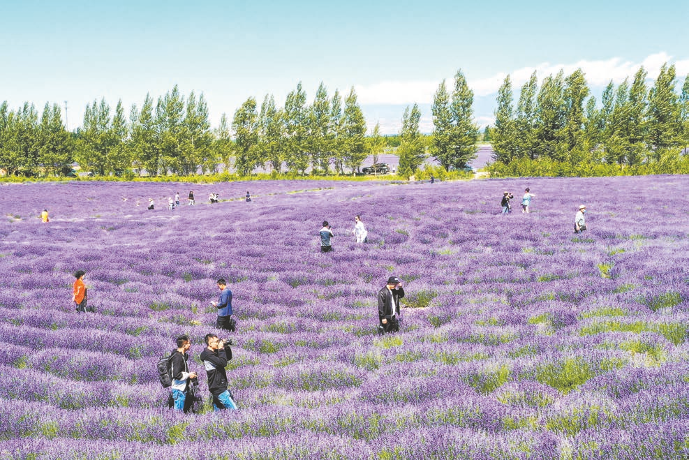 在新疆霍城县芦草沟镇四宫村,游客在薰衣草田里拍照(6月13日摄)。
