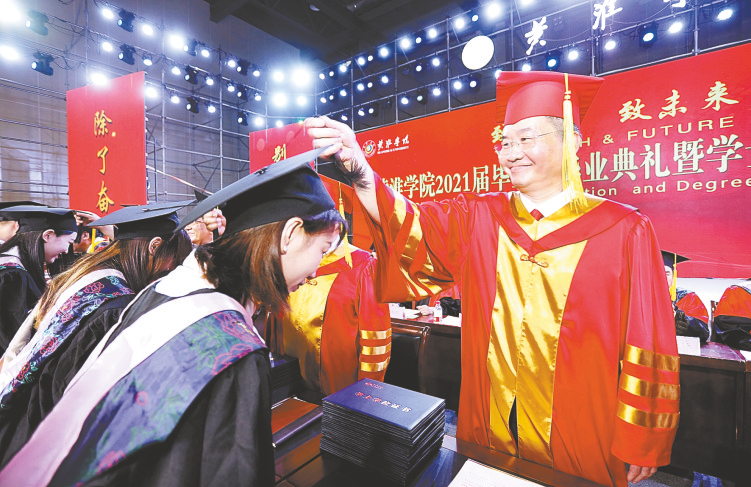 校领导为学生代表颁发学士学位证书并拨流苏。一张张激动的笑脸,一个个挺拔的身躯,在接过学位证书的那一刻,印证着一场青春的故事从青涩走到成熟,从相聚走向别离。