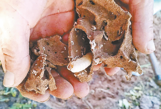6月17日,数名来自湖北省麻城市白蚁防治所工作人员在驿城区老河水库大坝挖掘白蚁巢穴,灭杀白蚁。