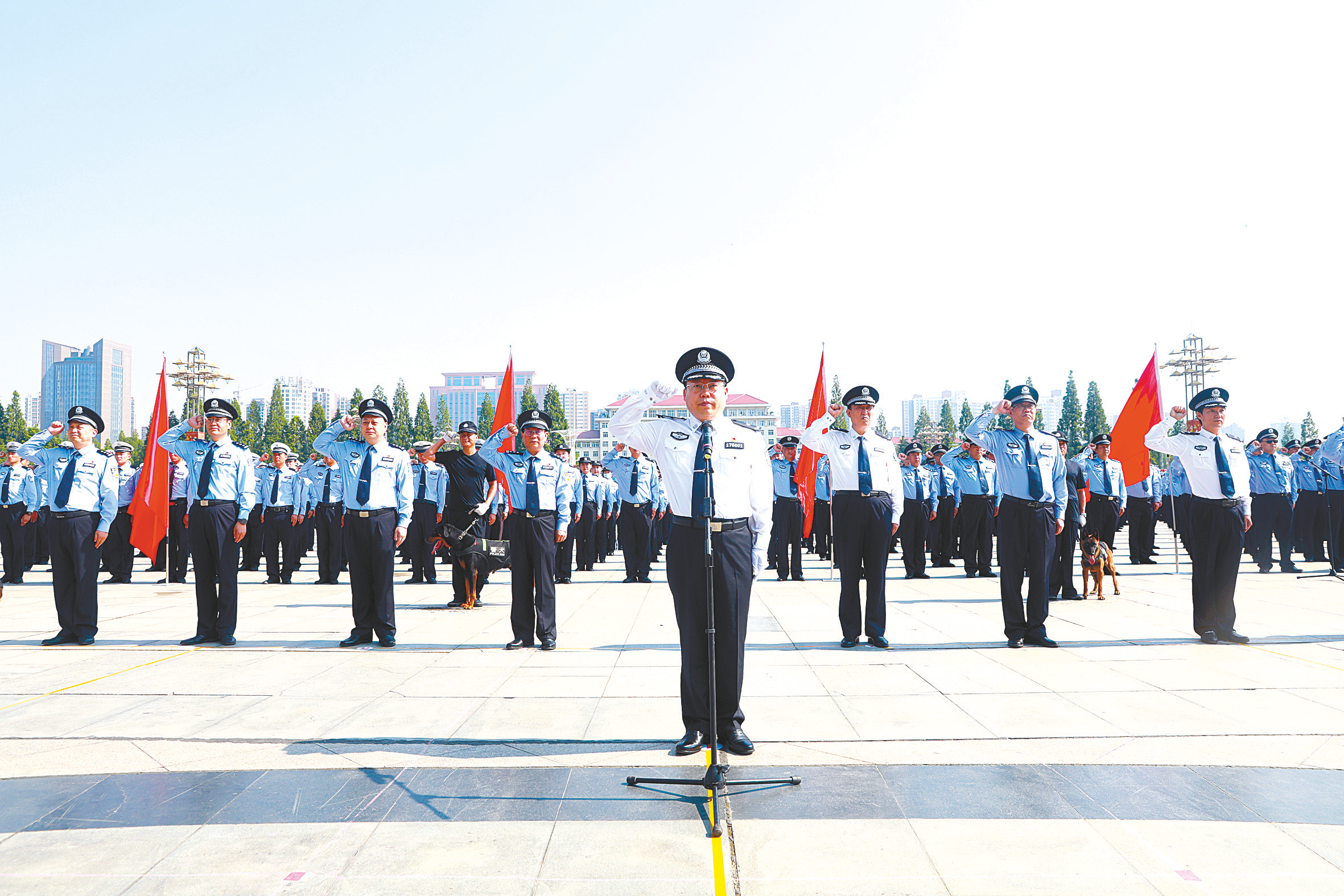 警旗猎猎铸忠诚,警徽闪闪不染尘。执法公正聚民心,纪律严明担重任。危难时刻舍自身,咱是平安守护人。为热烈庆祝中国共产党成立100周年,全面展示驻马店市公安队伍积极向上、拼搏进取的良好风貌和敢打必胜、能拼善赢的过硬本领,激励全市公安机关打赢建党100周年安保维稳的坚定决心和必胜信心,6月22日,驻马店市公安局在天中广场隆重举行全市公安机关庆祝建党100周年安保维稳决战决胜誓师大会暨全警实战大练兵汇报演练。