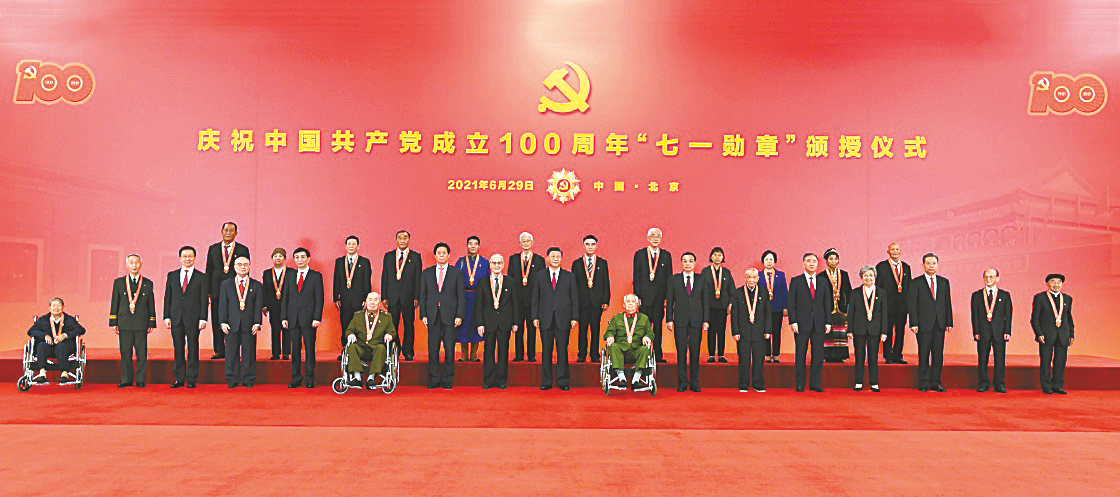 6月29日,庆祝中国共产党成立100周年“七一勋章”颁授仪式在北京人民大会堂金色大厅隆重举行。中共中央总书记、国家主席、中央军委主席习近平向“七一勋章”获得者颁授勋章并发表重要讲话。 新华社记者 丁 林 摄