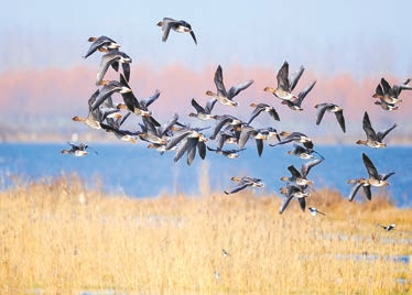 宿鸭湖畔候鸟翔集。 记者 弓华静 摄
