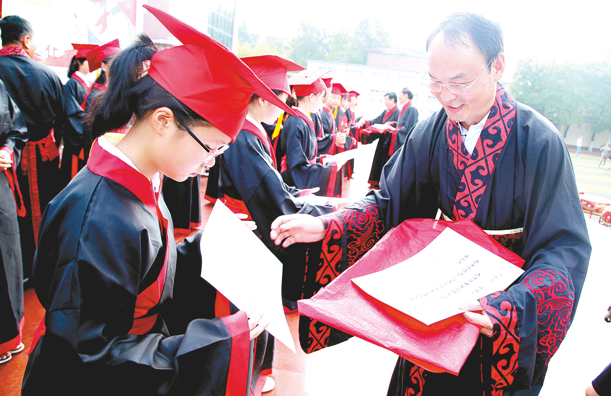 仪式上,该校毕业生身着国学服在学校领导和教师的带领下穿越成童门,依次完成了向儒门先圣行大礼、学子盟誓、击鼓明志、拜谢家长和母校、接受毕业纪念册等环节。