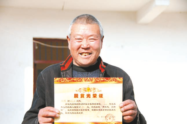 脱贫户焦大得领取脱贫光荣证。