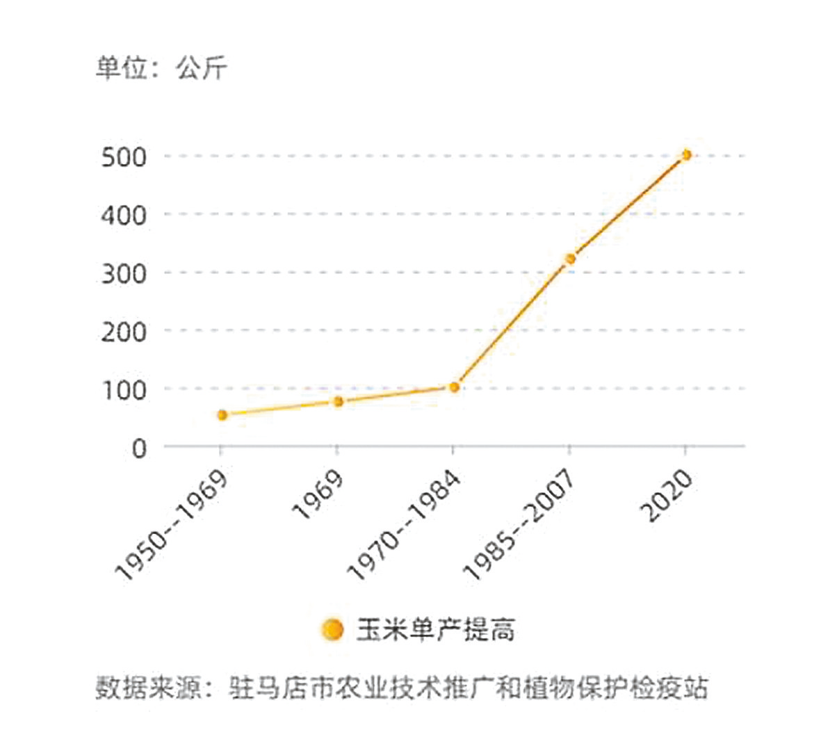 1950年~1969年玉米平均单产51.9公斤,其中单产最低是1950年,只有28公斤,1969年平均单产最高,75.0公斤;1970年~1984年玉米平均单产大部分年份在100公斤以上,单产最高的是1983年,247公斤,最低的年份是1975年,平均单产只有45.5公斤;1985年~2007年玉米平均单产321.1公斤,2020年玉米平均单产突破500公斤大关。