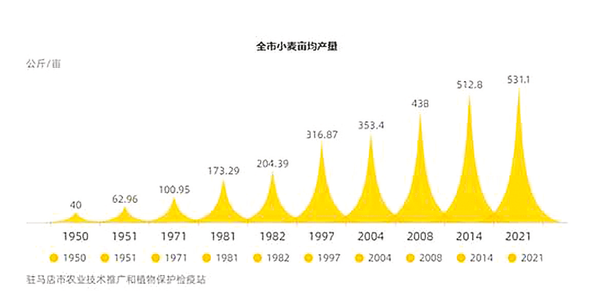 1950年全市小麦亩均产量不足40公斤,1951年全市小麦亩均产量突破50公斤(62.96公斤/亩),1971年全市小麦亩均产量突破100公斤(100.95公斤/亩),1981年全市小麦亩均产量突破150公斤(173.29公斤/亩),1982年全市小麦亩均产量突破200公斤(204.39公斤/亩),1997年全市小麦亩均产量突破300公斤(316.87公斤/亩),2004年全市小麦亩均产量突破350公斤(353.4公斤/亩),2008年全市小麦亩均产量突破400公斤(438.0公斤/亩),2014年全市小麦亩均产量突破500公斤(512.8公斤/亩),实现全市小麦平均亩产破千斤、总产量破百亿斤大关。2021年全市小麦收获面积1165.17万亩,平均亩产为531.1公斤,总产达到618.82万吨,为历史最高,实现了全市小麦生产十八年连续丰产丰收。