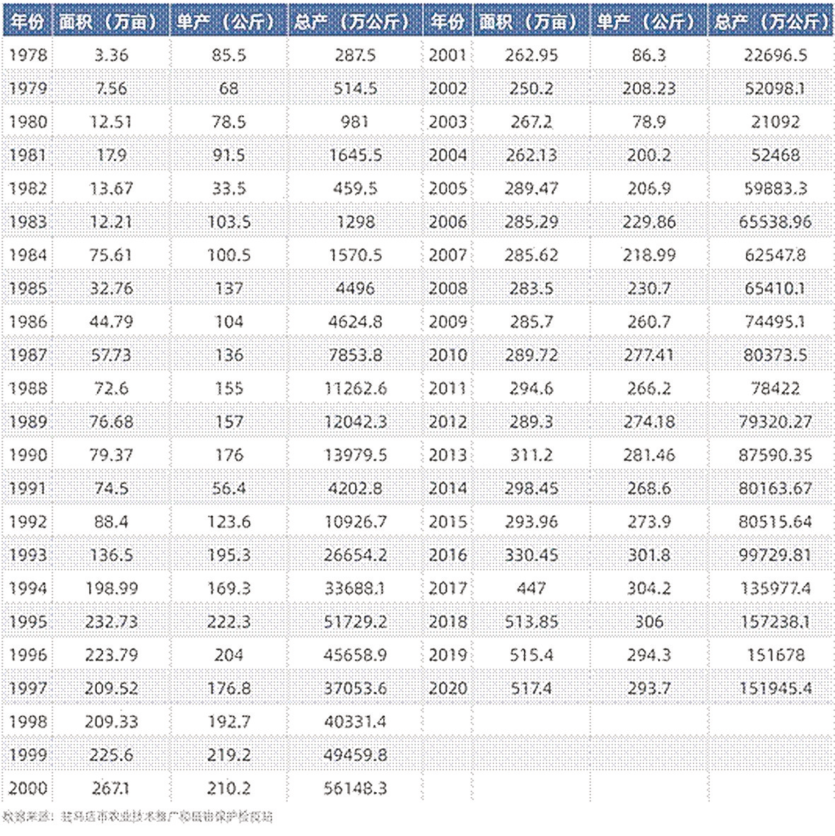据统计,1987年~2020年,我市蔬菜的面积从最初的44万亩到2020年的164万亩;产量从最初的41.33万吨到2020年的407万吨,蔬菜面积和产量翻几番。