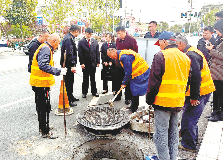 汝南县人民检察院干警现场督导新型窨井盖安装。