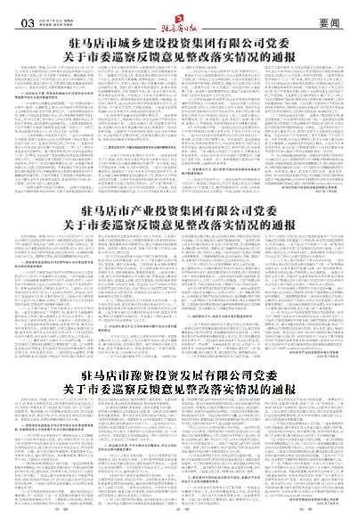 驻马店市产业投资集团有限公司党委关于市委巡察反馈意见整改落实情况的通报