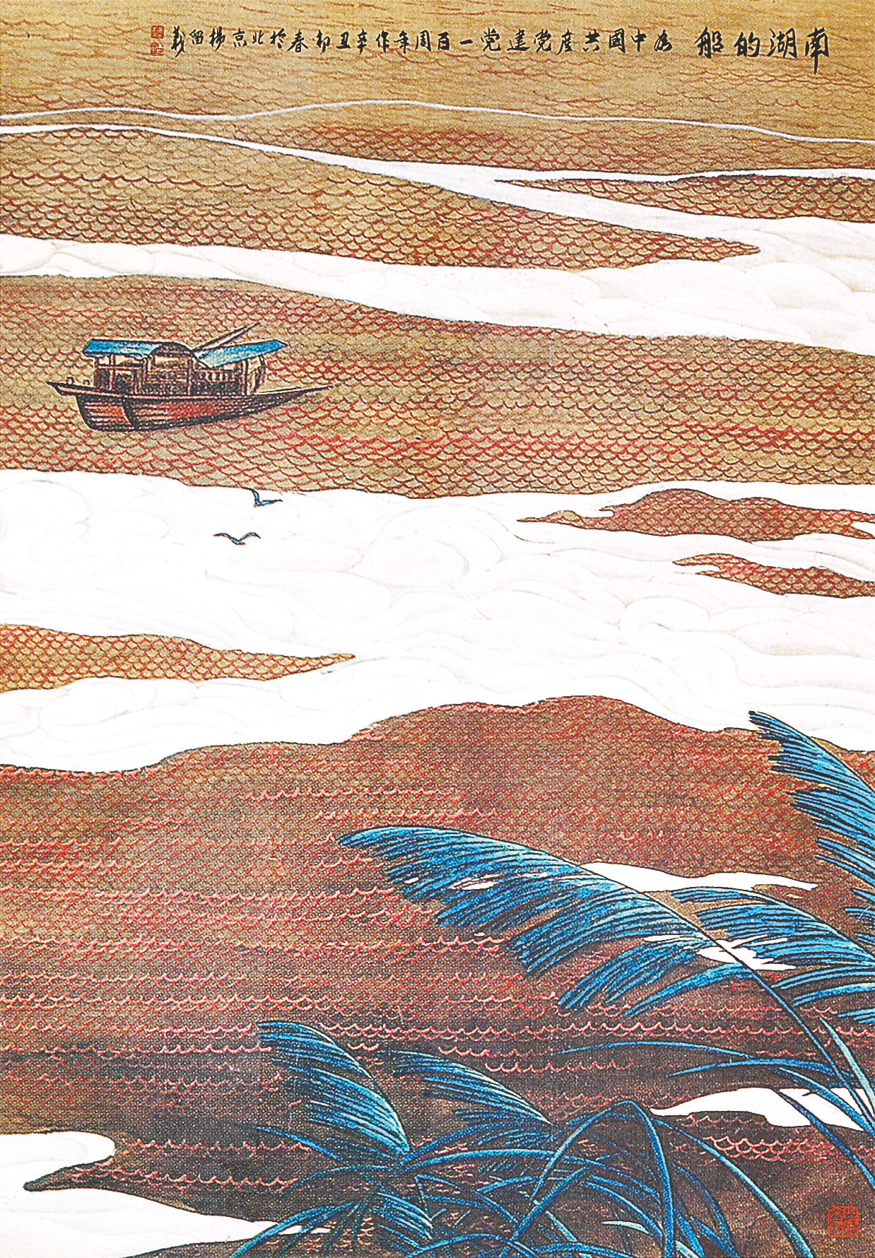 整幅作品在红船的渲染下,波光粼粼的湖面荡漾着一层一层的红色涟漪,象征着在“红船精神”的鼓舞下,我们党团结带领人民从南湖红船出发,历经五次反围剿、两万五千里长征、抗日战争、解放战争到新中国成立,再到改革开放、进入新时代,无论是决胜脱贫攻坚,还是有效防控疫情,中国共产党始终坚定不移走中国特色社会主义道路,人民生活显著改善,综合国力显著增强,国际地位显著提高,改革开放成为当代中国最显著的特征、最壮丽的气象。