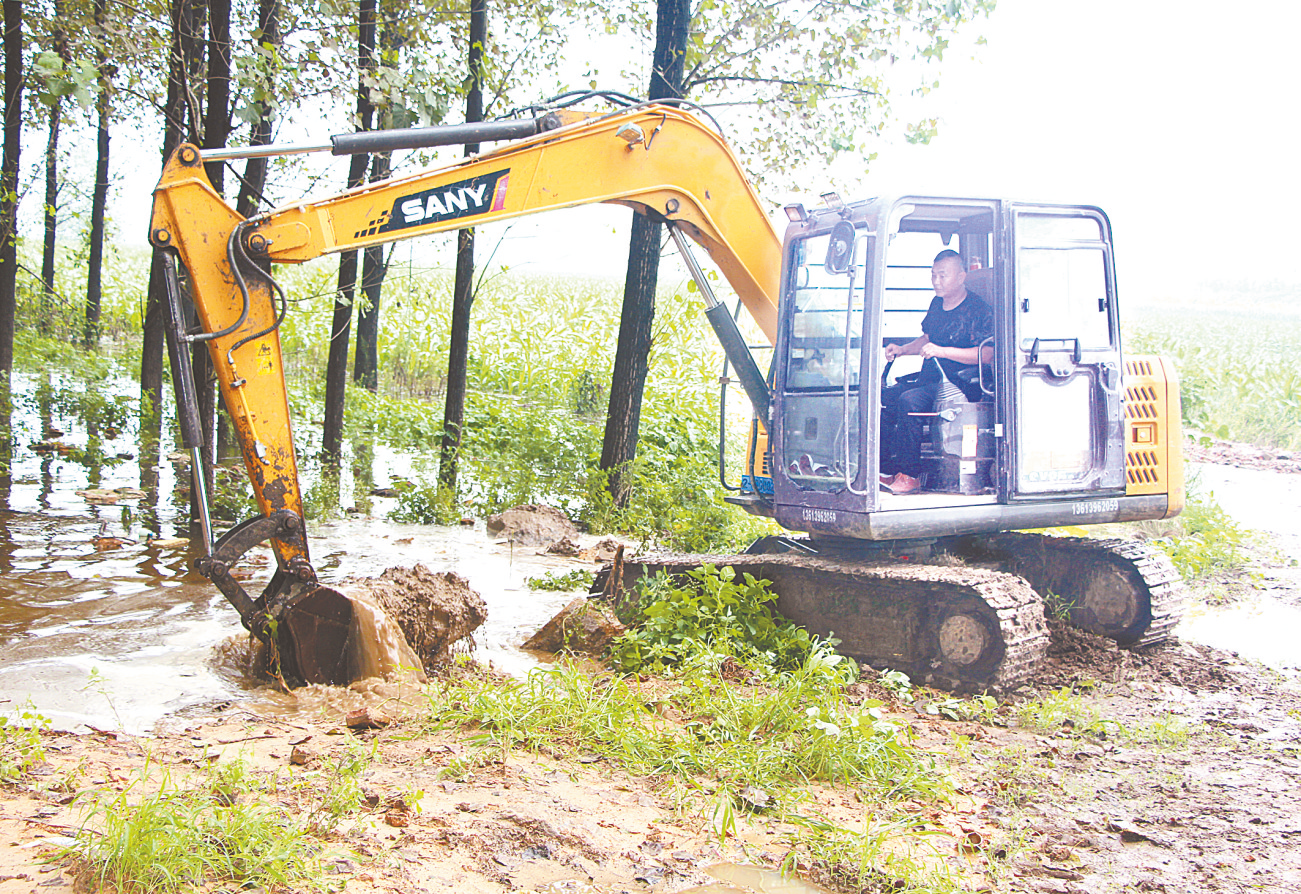 为应对连日来强暴雨天气,近日,遂平县阳丰镇党委、镇政府高度重视、科学研判,紧盯关键部位,严格落实责任,第一时间启动应急预案,全力保障群众生命财产安全。图为7月20日,阳丰镇郑湾村村民在进行农田排涝。 记者吴胜军 摄