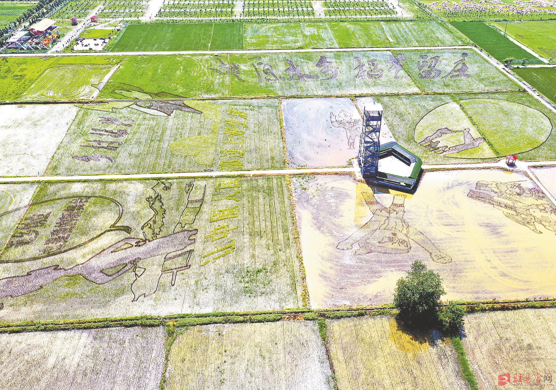 近日,无人机拍下的确山县留庄镇国家3A景区稻田公园。在确山县留庄镇400多亩的稻田里,农民用秧苗绘就的“庆祝建党100周年”“国士无双”“腾龙祥云”等一幅幅栩栩如生的3D画卷,让游人流连忘返。