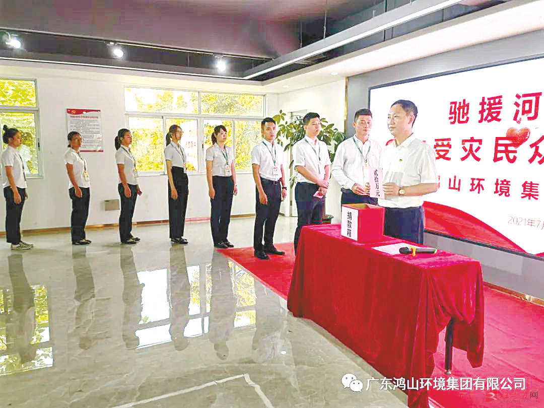 连日来,我省遭遇大范围极端强降雨天气,灾情牵动着亿万国人的心。近日,广东鸿山环境集团有限公司心系家乡灾情,开展爱心募捐活动,公司全体员工踊跃参与,共向河南省红十字会捐款260600元。 记者 王新军 摄