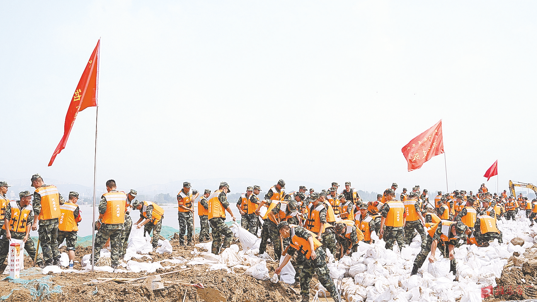武警河南总队某支队官兵在新乡市卫河河堤上装填沙袋