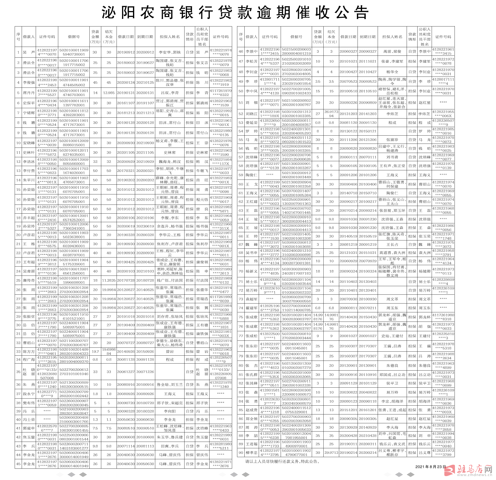 泌阳农商银行贷款逾期催收公告
