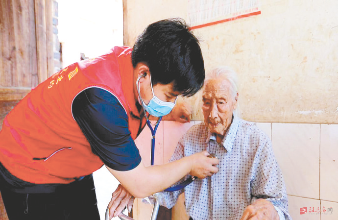 8月18日,汝南县金铺镇志愿者和医务人员为留守老人提供义诊服务。