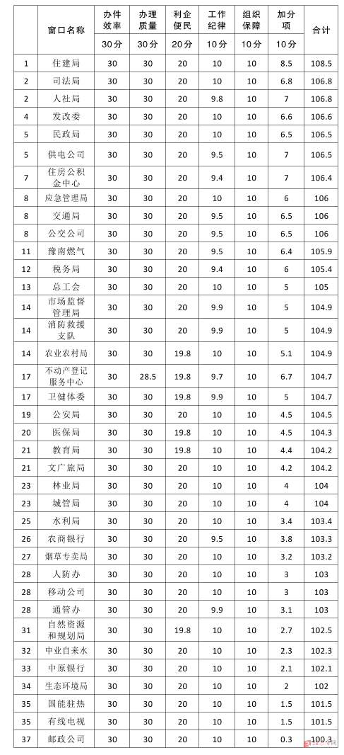 市民中心进驻窗口单位8月份服务效能评价排名