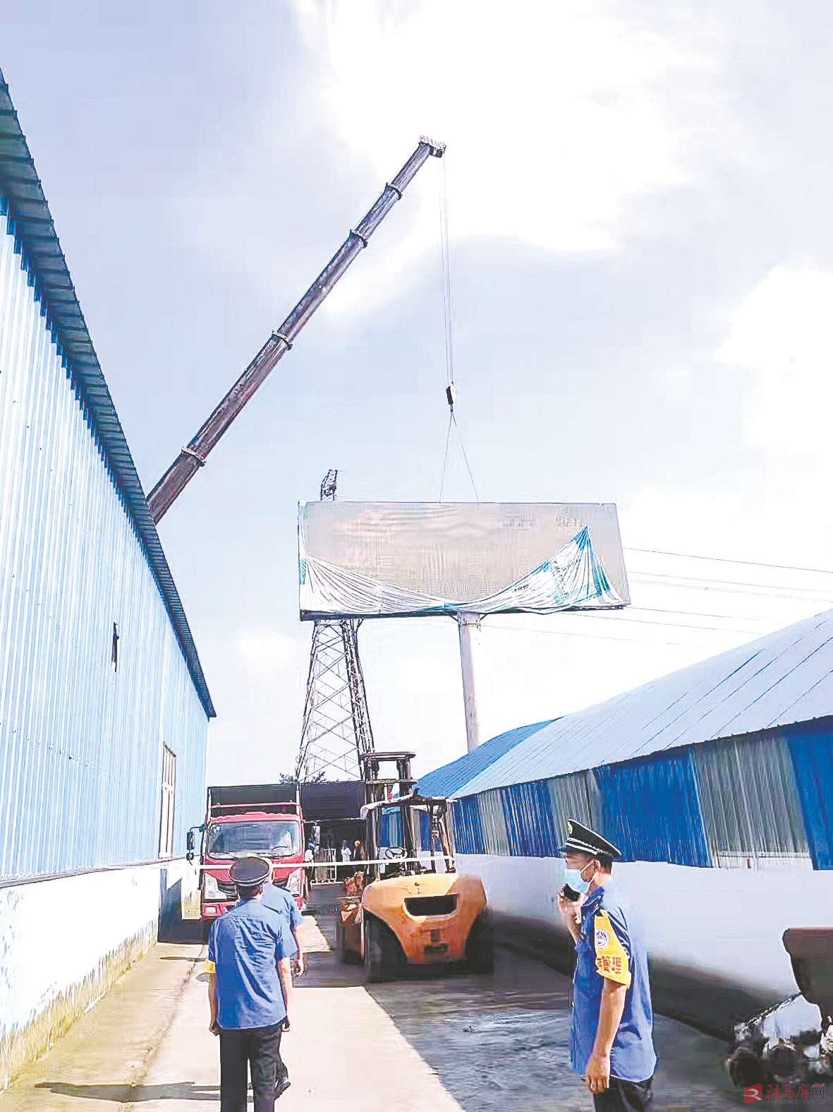 9月8日~9日,市城管执法支队组织执法人员对位于市区中原大道与练江大道交会处西北角广告塔、开源大道与汝宁路交会处东北角广告塔依法进行了拆除。这两处广告塔紧邻主干道,由于年久失修,主体结构已经腐蚀生锈,存在较大安全隐患,严重影响市容市貌。为保证拆除工作安全高效快速展开,该支队提前谋划,组织执法人员现场保障,确保拆除过程中施工人员、通行群众安全。 记者 马国省 摄