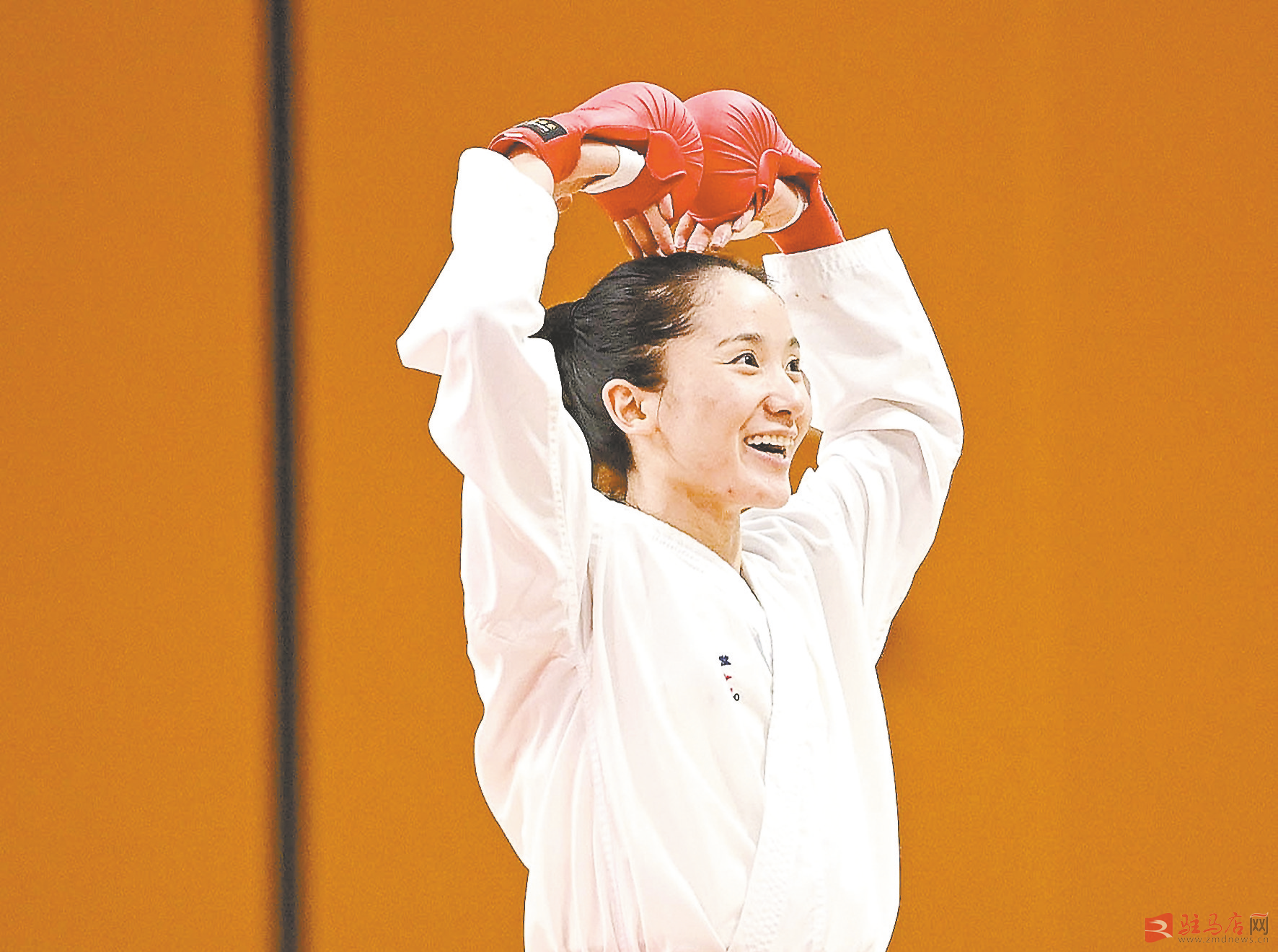 9月17日,在西安举行的第十四届全运会空手道女子55公斤级决赛中,河南队选手李冉冉战胜队友丁佳美,夺得冠军。图为李冉冉在赢得比赛后比心。